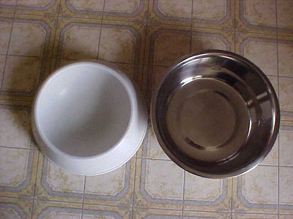 This is for 2 med. to large size pet food bowls. One for water, one for food. The white food one measures 11" across the bottom. The metal water is 11" across the top and 4" deep...New condition, just been setting around. $10.00...Cash Only...Must Pick Up...
