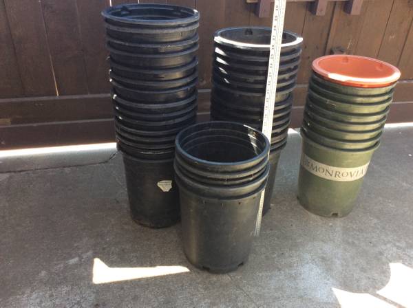 Lot of 50-5 gallons black plastic nursery pots in great condition. See photos for details Price is for lot of 50 pots.