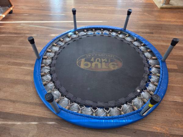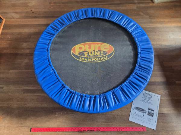 38” mini-trampoline in very good condition. Includes Owner’s Manual. Height is 9” and legs are removable for easy storage. Weight limit: 220 lbs. Owner’s Manual suggests a handful of exercises and there are lots of free exercise trampoline workout videos on YouTube. (For scale, see ruler and yardstick in photos.) Cash only.