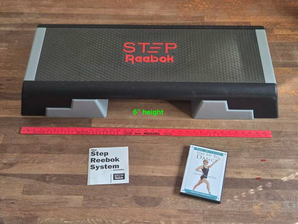Reebok Step is in excellent condition. It features ‘click and lock’ height adjustments to 6”, 8” and 10” for tailoring workout intensity. It has a textured surface for grip and slip-resistant rubber feet. Comes with a “Step Up to Dance” DVD. There are also many free YouTube videos that take advantage of the step to do strength, core and HIIT workouts in addition to aerobics. Weighs about 14 lbs. (Yardstick in the photos is for scale.) Cash only.
