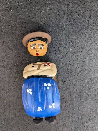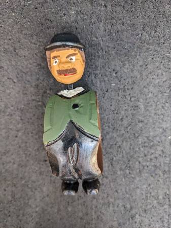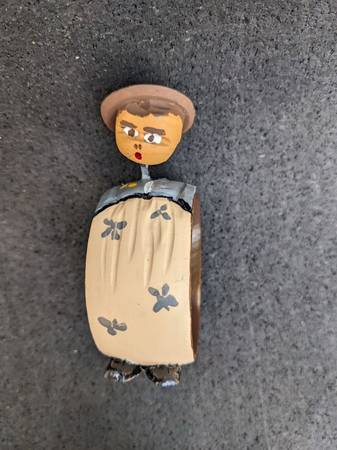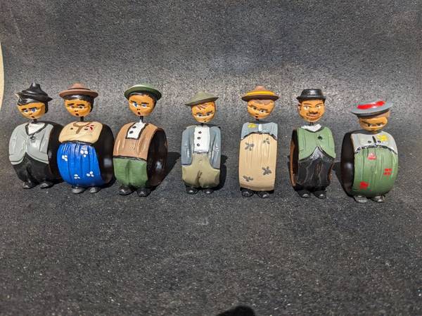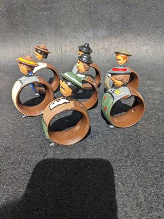This is a one-of-a-kind item: A set of seven beautifully restored, hand-carved vintage napkin rings … with fun bobble-heads.