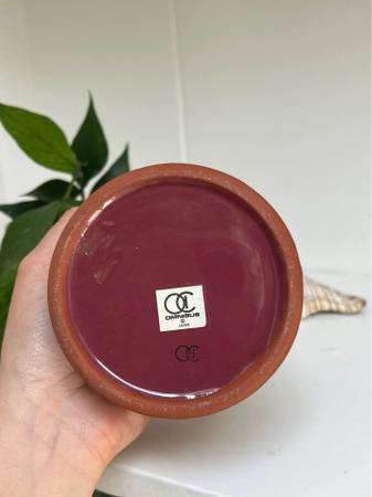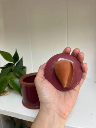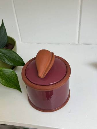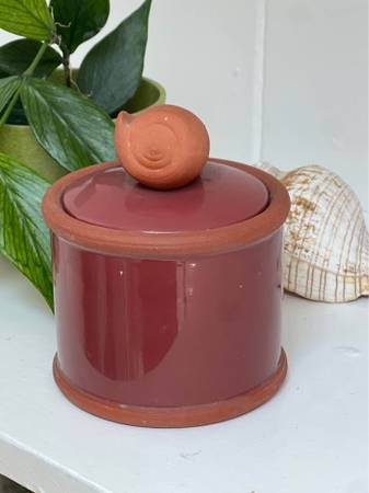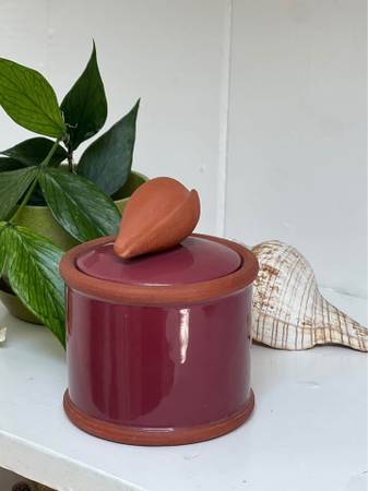 Beautiful handmade jar featuring a rich maroon glaze and natural terracotta accents. The lid is topped with a sculpted shell handle, adding a subtle beach charm to the piece.