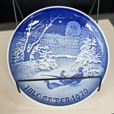 1970 Bing & Grondahl Christmas plate, designed by Henry Thelander, has the title Pheasants at Christmas. 1970 Bing & Grondahl Christmas plate depicts one of the most common wild birds in Denmark,the pheasant. The birds are seen in a winter clad countryside. In the backround we see a typical Danish farm house.