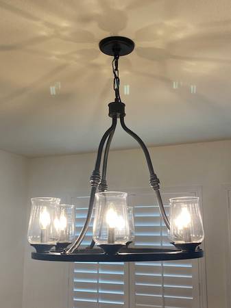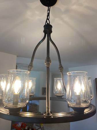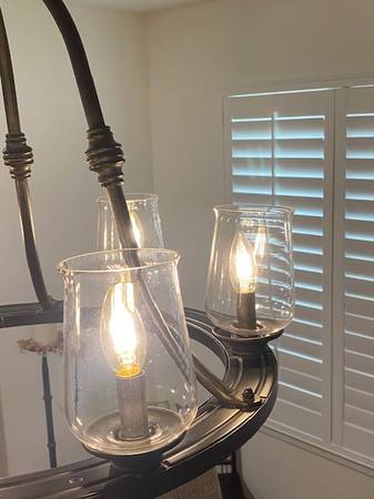 Round heavy-weight chandelier from Pottery Barn. Includes new LED bulbs and is in excellent condition. We are changing the style of our home and want to sell this. It also includes a few extra glass shades and LED bulbs. The size is: 23" diameter x 25" tall to the top of the round hanger. It can be adjusted for your ceiling height.