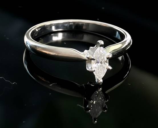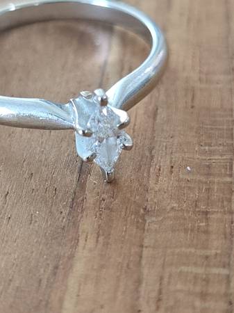 Engagement ring purchased from Kay Jewelers. Marquise-cut diamond, under 1 carat 14K white gold band, stamped “14K MAGIC GLO” Ring weight: approx. 2g Condition: gently worn, good overall Ring size...