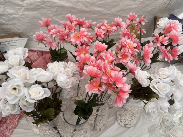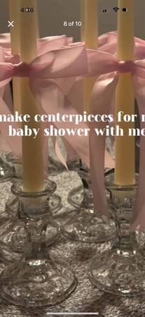 50 for all of it or I can sell separately. The box has 15 pink& white flower arrangements, and 15 plastic vases, about 13 candles with 15 glass holders, 15 thin table runner cloths shown in pic. 12 mini bows to put on candles example shown in pictures. 3 fake flowers vines. A sign holder as well to hold a babyshower/party sign that was purchased in hobby lobby. Has about 26 white & pink balloons that were left that we didn’t use. Cloths may need a gentle