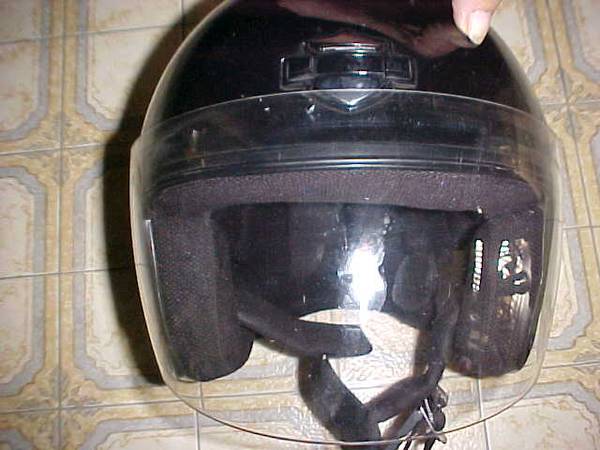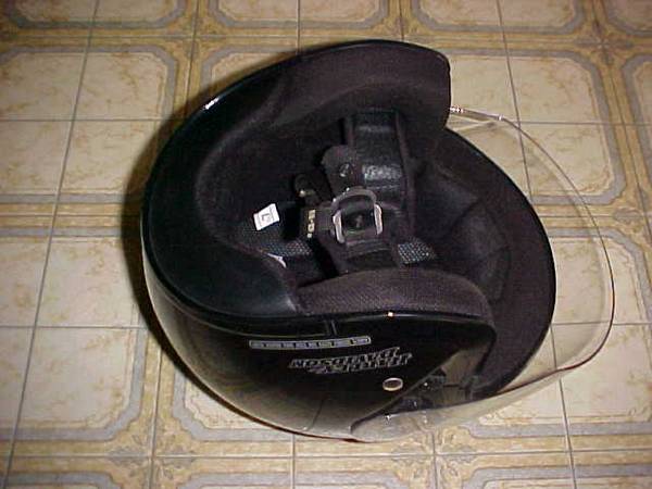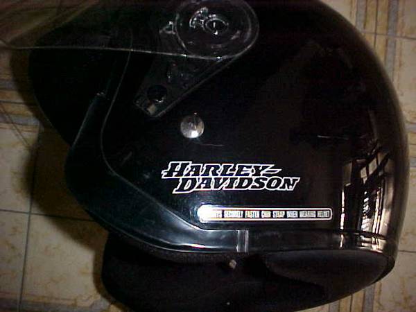 This is for a Harley Davidson, Jet II Motorcycle, Face Shield Helmet, DOT. Size: Large or Size Med. Black. Very Good Condition, with a few light dings on top, from rocks. It comes with a dust bag....