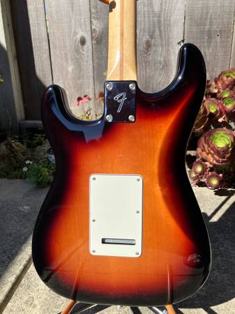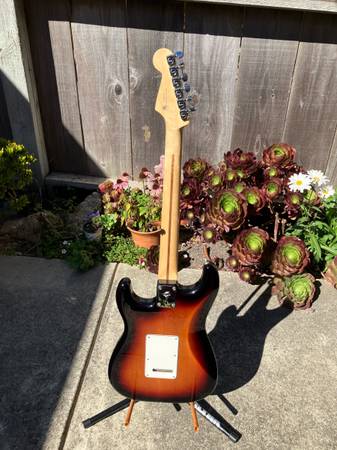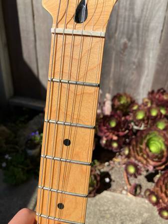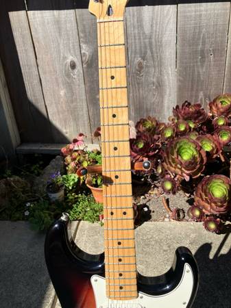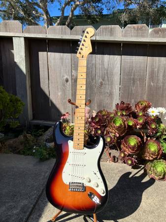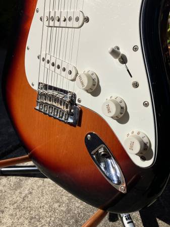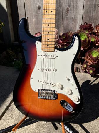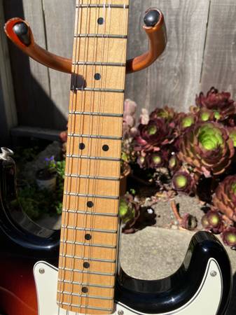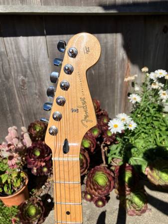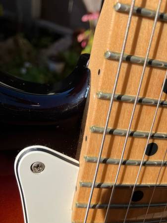 2021 Fender Player Series Stratocaster. 75th Anniversary edition. MIM. Fantastic sounding, playing, and looking Strat. Finish is in near mint condition. Really cool wood grain on body and neck. Very little play/fret wear. Fresh set of .009 gauge strings. The only thing not original is the middle pickup which is a “Custom Shop Vintage Style Pickup” from a Robert Cray Strat.