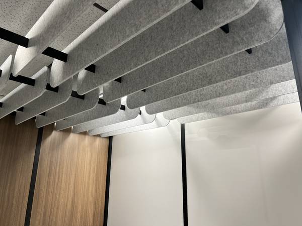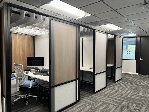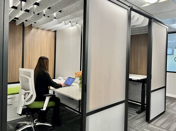 A dedicated desk station comes with a heigh-adjustable desk, ergonomic chair, lockable cabinet, whiteboard, and a sliding door and acoustic felt ceiling baffles for added privacy. All in one inviting modern design.