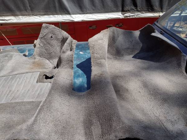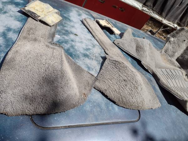 This is front left center right solid / cut grey carpet. Not new. Used. could use a good cleaning. also are the wheel arch round corner going to top around seatbelt mount bolt. Also have carpet between seats.that four pieces. Asking 200.