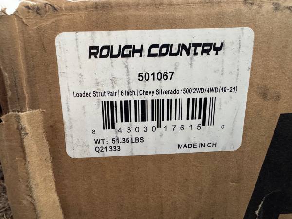 These rough country 6 inch lift struts are new in the box, they fit 2 Wheel Dr. and four-wheel-drive Chevy half ton 1500 pick ups built between 2019 and 2026.
