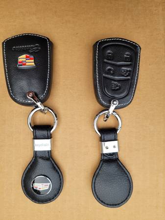 2 leather key fob cases with Cadillac logo for sale. These fit multi-year, 5-button remote key fobs. Each comes with a small screwdriver to open and close the stainless steel hardware. These cases are made of good quality, thick leather. They are 3 years old, and still look new!