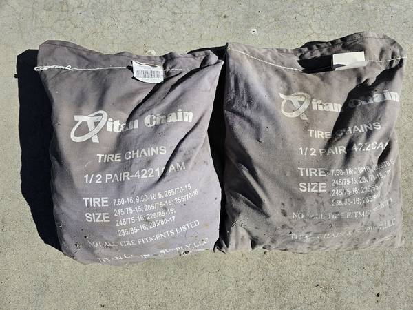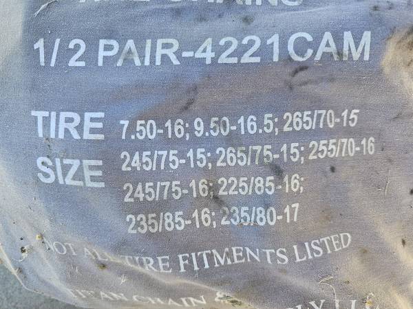 Brand New SNOW CHAINS for DUALLY Tires Still in sewn and sealed bags. Chains for all four tires of a Dually truck application. See the tire sizes on one of the pictures. $150 Tom 408 six seven one...