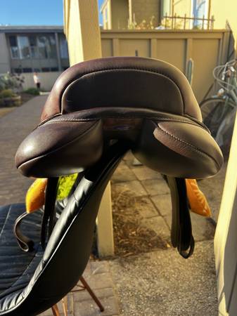 18" jump saddle in good shape, stored properly, leather is well maintained and taken care of. only used for a few months but it does not fit my new horse which is the only reason why I am selling it- otherwise I would keep it, its comfy and looks great in the show ring. Comes with saddle, full easy change gullet system (all sizes except the green "medium narrow" bar), leathers and irons and saddle cover. No trials. Pick up in either Gilroy or Monterey. Open to reasonable offers.