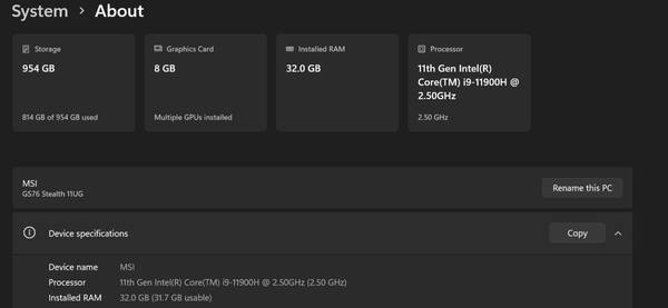 The MSI GS76 Stealth 17.3" Laptop is a high-performance gaming and graphic design laptop featuring an Intel Core i9 11th Gen processor, NVIDIA GeForce RTX 3070 dedicated graphics, and a 1TB SSD for fast storage and data access. With 32GB of RAM and a maximum resolution of 2560 x 1440, this notebook is designed for demanding tasks and games. The sleek black design, backlit keyboard, and Windows 11 Home operating system make it a stylish and powerful choice for users seeking a top-tier laptop experience.