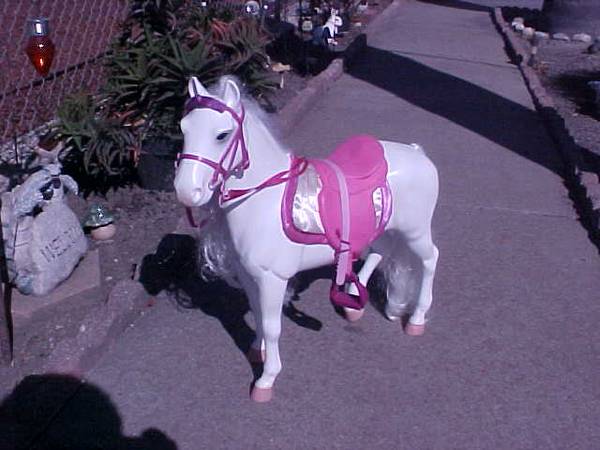 This is for a Large Plastic White Horse with Mane and Tail Hair, Saddle and Bridle. Size: Approx. 20"x 19". Very Good condition, main and tail a little messy (see in photo's). CAN USE WITH AMERICAN...