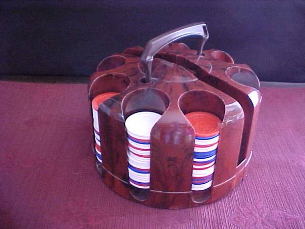 This is for a Vintage 8 slot, Marbleized Swirl Plastic, Revolving Card Holder/Poker Chip Caddie. Chips included. Approx. 5" high x 7" wide. Ex. Condition. $26.00...Cash only...Must Pick Up...