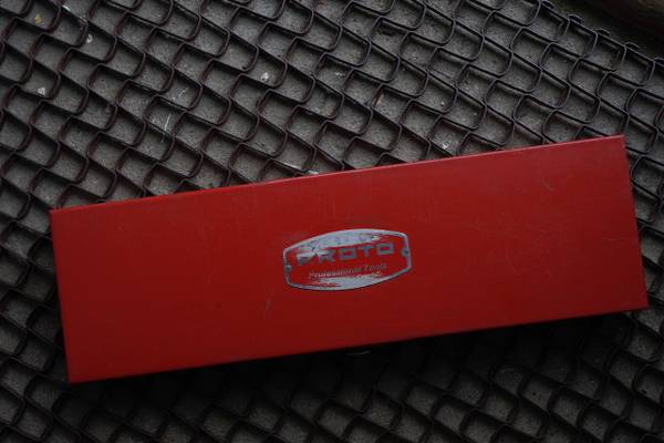 Proto Professional 16 Pcs (Shallow: 1 1/4, 1 1/8, 1 1/16, 1, 15/16, 7/8, 13/16, 3/4, 11/16, 5/8, 9/16, 1/2 & 7/16, Extension: 3", Ratchet: 9" and Breaker Bar: 14 1/2",, Steel Case and the Plastic Inner Case is Very Good Condition, The Buckle Locks Well, Total Weight: 10 lbs, Dimension of the Case: 17 x 5 x 2, I Brought this 15 years Ago, Second Owner, Made in USA