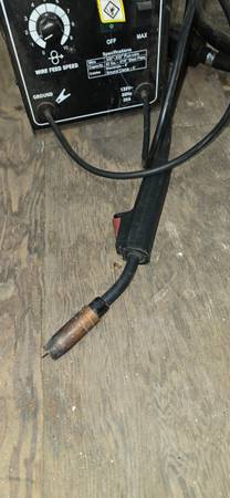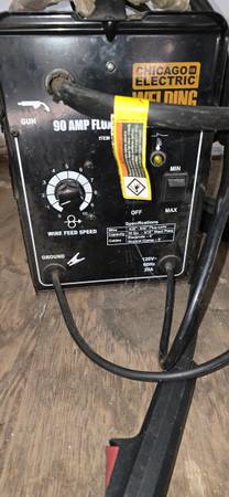 This is an entry-level flux-cored welder typically sold at Harbor Freight. It uses flux-cored welding wire, which eliminates the need for a separate shielding gas. The welder is designed for home and light shop use and can weld mild steel from 18 gauge up to 3/16 inch thick. The controls include a variable-speed wire control and a high/low switch for amperage. Some reviews mention that the machine has a low duty cycle, meaning it requires cool-down periods after use. The 90-amp model has also been succeeded by the 125-amp version.