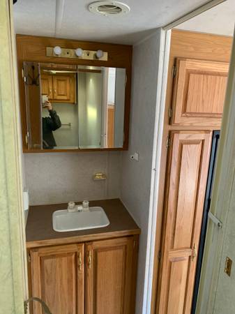 It has toilet shower vanity double kitchen sinks, microwave stove oven refrigerator central heat, and air conditioner. Also have ceiling fans lots of closet drawers cabinet and storage space entertainment center comes with TV radio