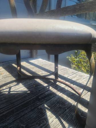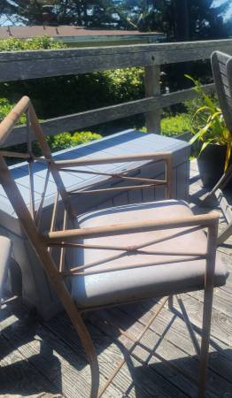 Two modern style chairs made of metal, one is solid. Worn from being out on a deck, but could be restored with painting, etc.