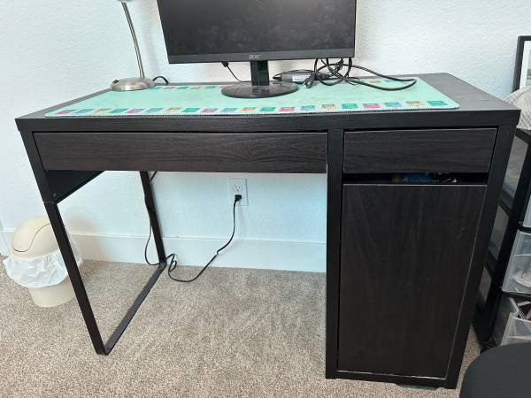 Free black desk with two drawers and shelves, has some flaws in table top.